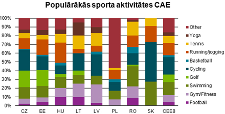 Kopumā riteņbraukšana kā populārākais uzņēmēju sporta veids ir Slovākijā (45%), Čehijā (24%), Latvijā (24%) un Lietuvā (20%). Ungārijā populārākā sporta aktivitāte uzņēmējiem ir skriešana (23%), Rumānijā – peldēšana (23%), savukārt Polijā - volejbols (57%).