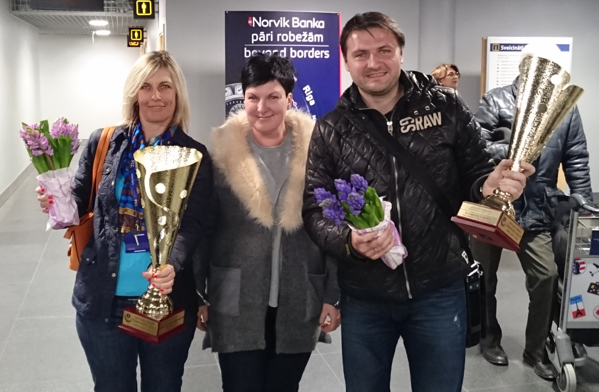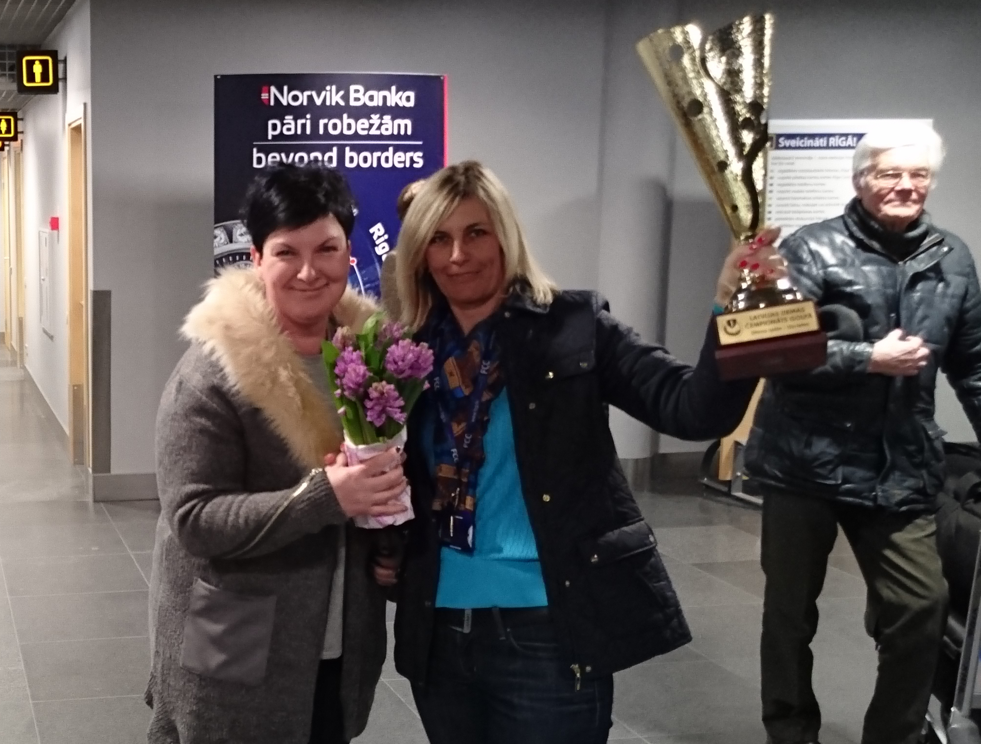 Latvijas Ziemas amatieru čempionāta uzvarētājus pēc atgriešanās Rīgā pēdējie patīkamie pienākumi vēl gaidīja lidostā, kur godam nopelnītās ceļojošās trofejas laureātiem pasniedza Latvijas Golfa federācijas ģenerālsekretāre Aiga Nesaule.