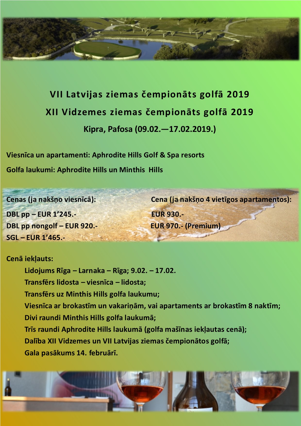 Lai cik golferiska un tīkama būtu lieliskā vasara, gaisā jau jūtamas vēsmas, kas atgādina, ka bezgalīga tā nebūs. Tādēļ augusts jau ir pienācīgs laiks, lai laicīgi ieplānotu ārpussezonas golfu. Daudzu golferu pārbaudīta un par labu atzīta iespēja ir dalība nule kā izsludinātajos Latvijas un Vidzemes ziemas čempionātos, kas notiks februārī Kiprā.